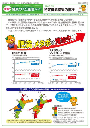 愛媛県民の健診データ等を活用し、経年変化を分析した結果をまとめました。 特に問題の大きい肥満やメタボ、高血圧を中心に、県民の状況を紹介しています。(R5.3発行)